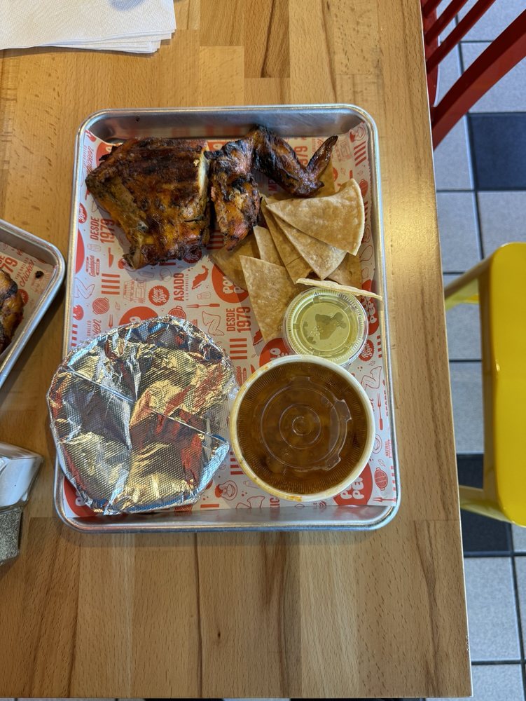 2 chicken. 2 pollos asados and 3 large sides (16 oz.) of your choice 4 salsas, tortillas, chile toreado jalapeno